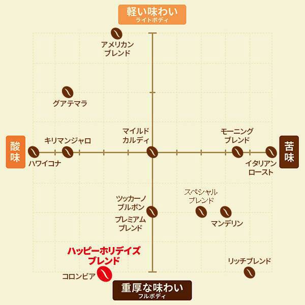 きらきらと輝くイルミネーションをイメージした冬限定のブレンド。シトラスピールを思わせる爽やかな風味、ボリューム感のある味わいをお楽しみください。 ※限定デザイン袋はなくなり次第スペシャルブレンド等と同じ通常パッケージでのお届けとなります。 ■手軽に楽しめるドリップコーヒータイプの取り扱いもございます。【ドリップコーヒー】ハッピーホリデイズブレンド