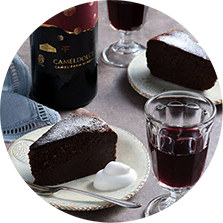 キャメルファームワイナリーのラインナップで最も甘口の赤ワイン。印象的なカカオやクローブ、シナモンの香りは、チョコレートと合わせると見事に調和。ワインの芳醇なアロマが、ガトーショコラのなめらかな口当たりに重なり、お互いをより深く堪能できます。食後のデザートとしてもお楽しみください。
