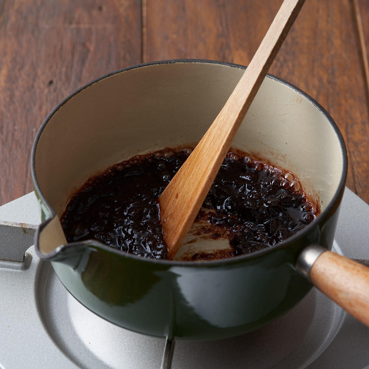 2 鍋に粗く刻んだドライプルーン、赤ワイン、はちみつ、レモン汁を入れて火にかけ、ゴムベラで混ぜながら水分が飛ぶまで煮詰め、冷ましておく。