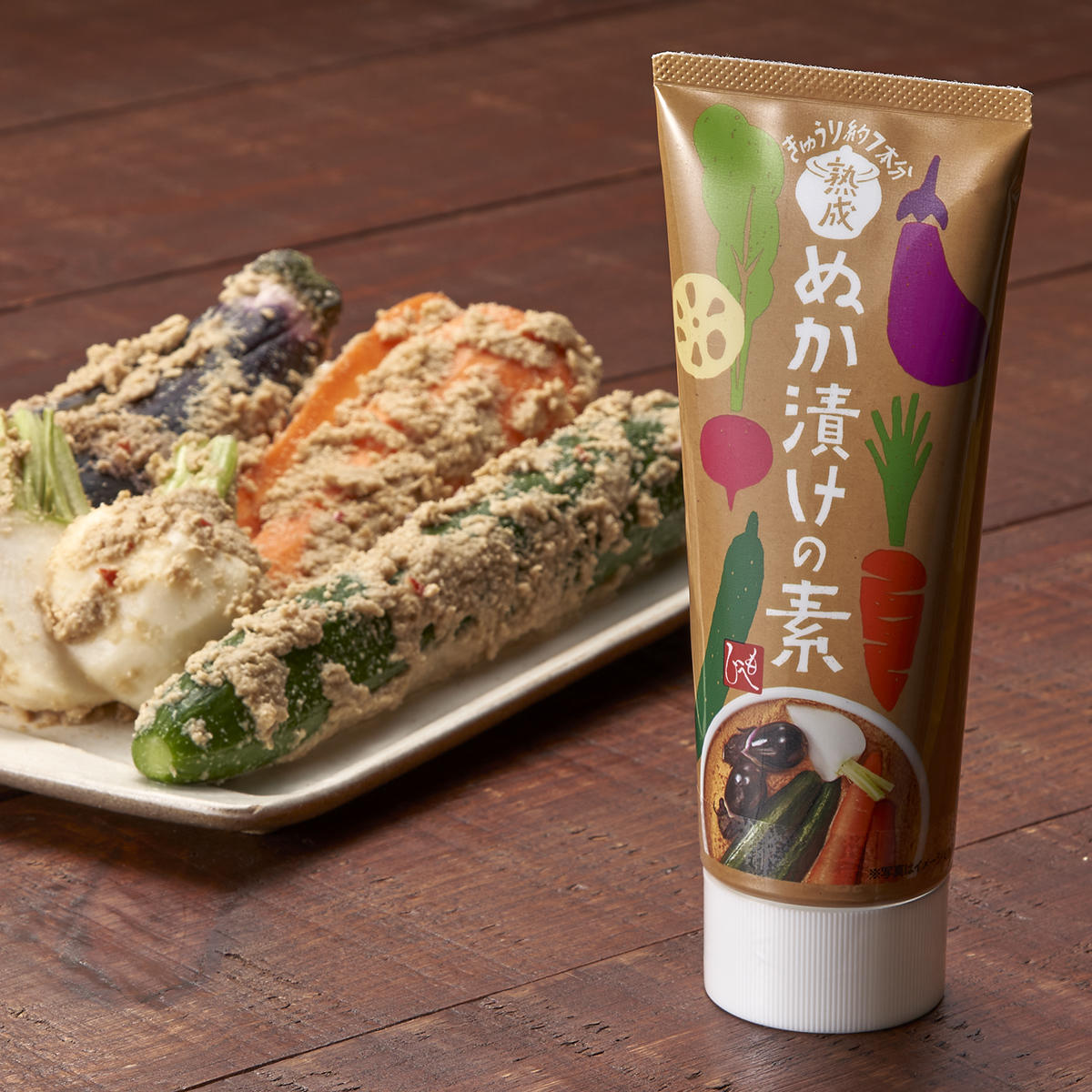 お好きな野菜に「ぬか漬けの素」を塗りこみ、ラップに包んで一晩冷蔵庫に置いておくだけで、簡単にぬか漬けが作れます。